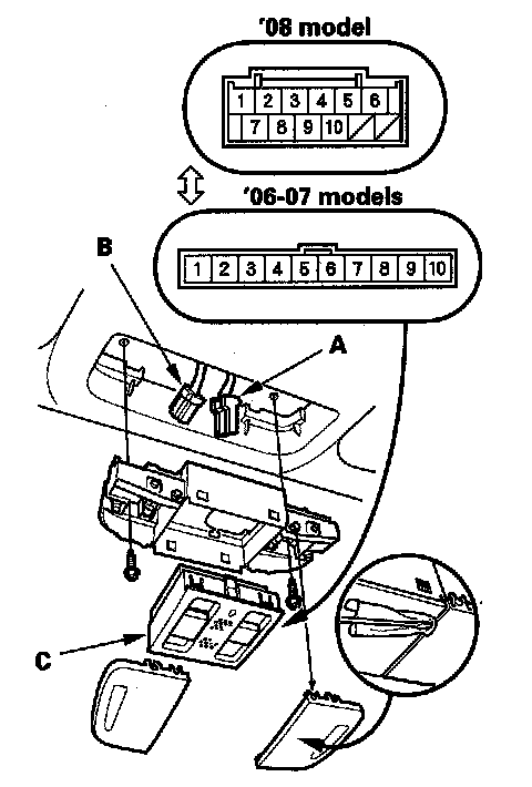 2. Disconnect the moonroof switch 10P [12P] connector (A) and map light 3P connector (B).