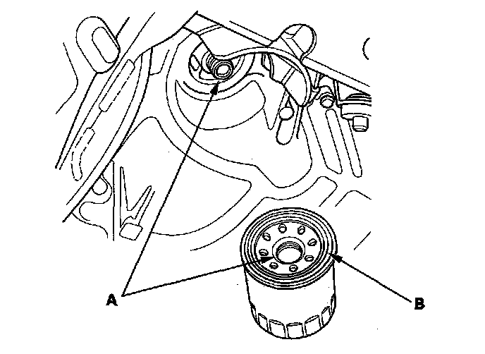 3. Inspect the threads (A) and rubber seal (B) on the new filter. Clean the seat on the oil pan, then apply a light coat of new engine oil to the filter rubber seal. Use only filters with a built-in bypass system.