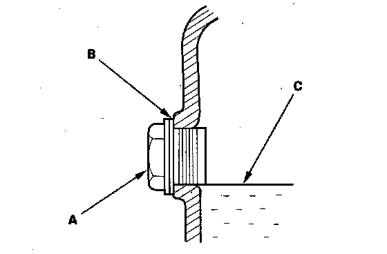 2. Remove the filler plug (A) and sealing washer (B), check the condition of the fluid, and make sure it is at the proper level (C).