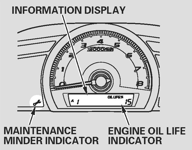 When the engine oil life is 15 to 1 percent, the maintenance minder indicator (Wrench icon) comes on every time you turn the ignition switch to the ON position, then it goes out if you switch the information display.