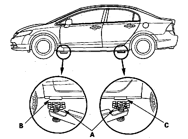 1. Position the lift blocks (A) under the vehicle's front support points (B) and rear support points (C).