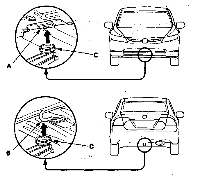 3. Position the floor jack under the front jacking bracket (A) or the rear jacking bracket (B). Center the jacking bracket on the jack lift platform (C), and jack up the vehicle high enough to fit the safety stands under it.