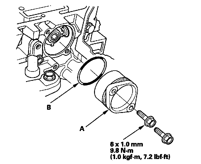 3. Install the camshaft thrust cover (A) with a new O-ring (B).