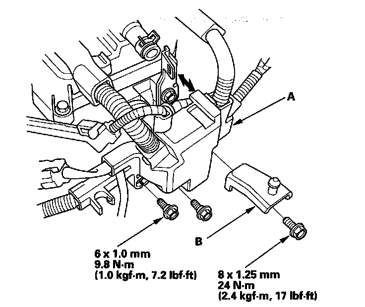 2. Remove the air cleaner housing bracket (A), then remove the harness holder (B) from the cylinder head.