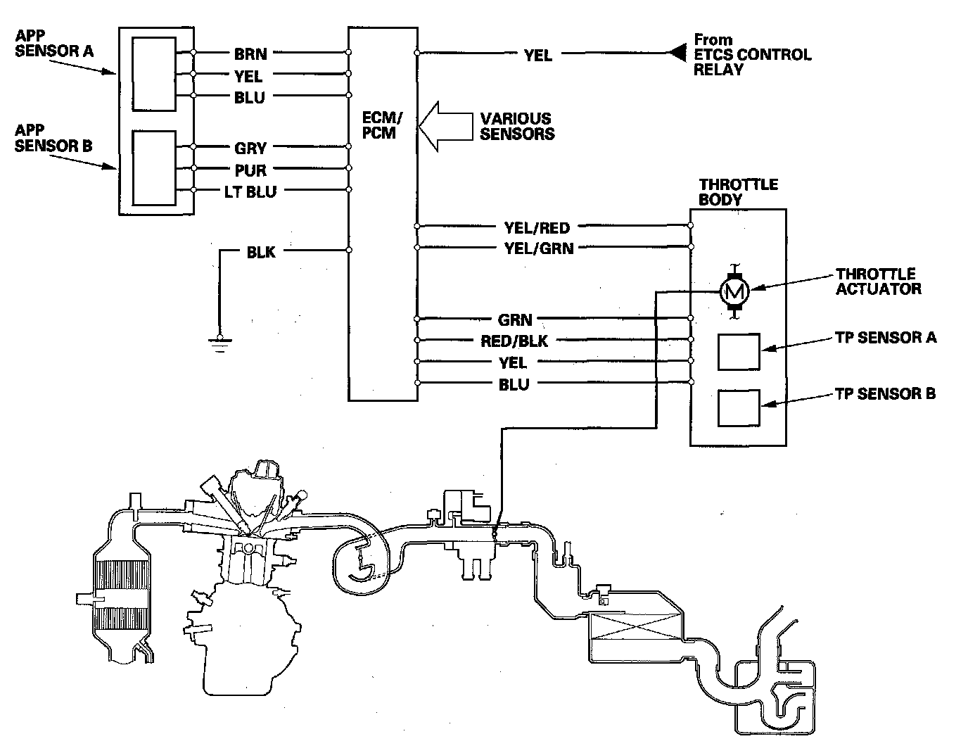 Electronic Throttle Control System DiagramThe electronic throttle control system consists of the throttle actuator, throttle position (TP) sensor A/B, accelerator pedal position (APP) sensor A/B, electronic throttle control system (ETCS) control relay, and the ECM/PCM.