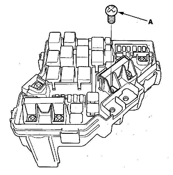 5. Turn the housing over again. Using two flat-tip screwdrivers, release the tabs (A), and pry up the fuse/relay box base (B) from the fuse/relay box housing (C).