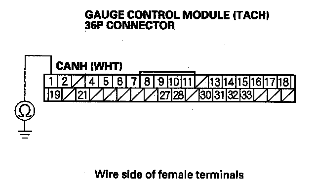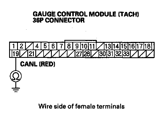17. Check for continuity between gauge control module (tach) 36P connector terminal No. 19 and body ground.