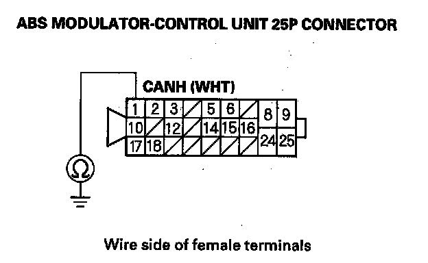 12. Check for continuity between ABS modulator-control unit 25P connector terminal No. 1 and body ground.