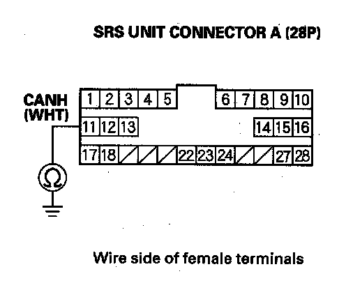 13. Check for continuity between SRS unit connector A (28P) terminal No. 11 and body ground.