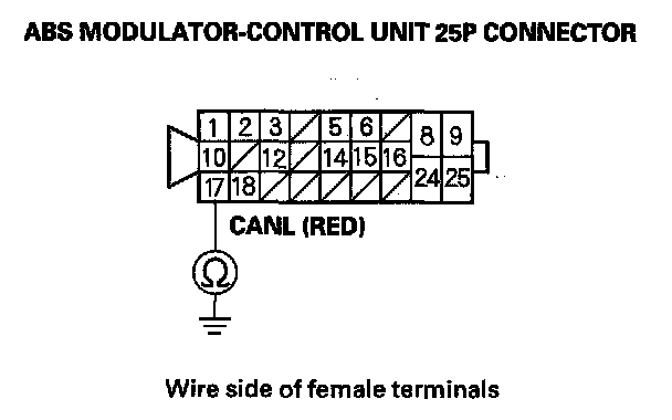 18. Check for continuity between ABS modulator-control unit 25P connector terminal No. 17 and body ground.