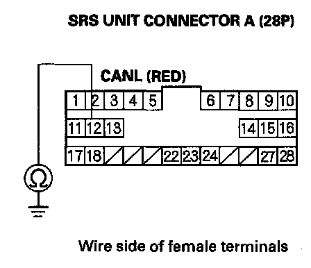 19. Check for continuity between SRS unit connector A (28P) terminal No. 12 and body ground.