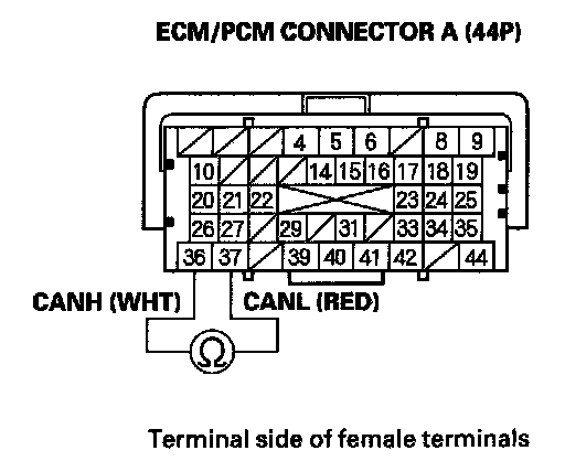 4. Measure resistance between ECM/PCM connector terminals A36 and A37.