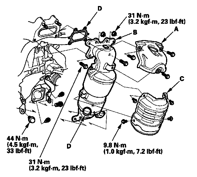 7. Install the parts in the reverse order of removal with new gaskets (D).