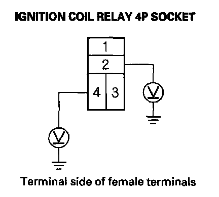 3. Measure the voltage between ignition coil relay 4P socket terminal No. 2 and body ground, then terminal No. 4 and body ground.