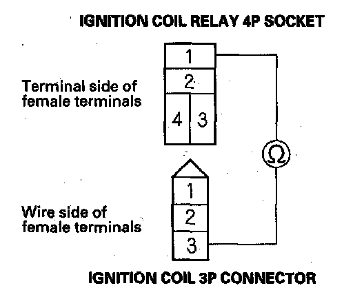 4. Check for continuity between each ignition coil relay 4P socket terminal No. 1 and the each ignition coil 3P connector terminal No. 3.