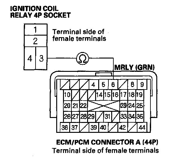 12. Check for continuity between ignition coil relay 4P socket terminal No. 3 and ECM/PCM connector terminal A6.