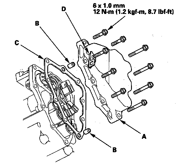 8. Remove the shift solenoid valve cover (A), the dowel pins (B), the gasket (C), and the harness clamp bracket (D).