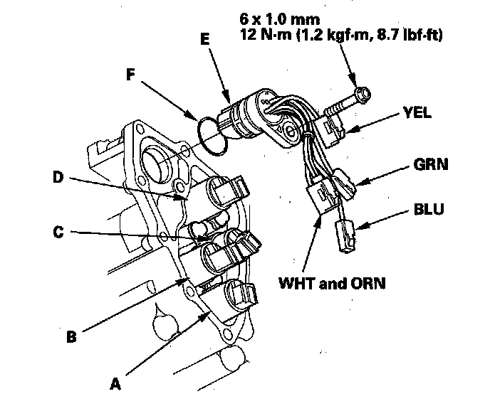 10. Install a new O-ring (F) on a new shift solenoid harness connector, and install the connector in the transmission housing.