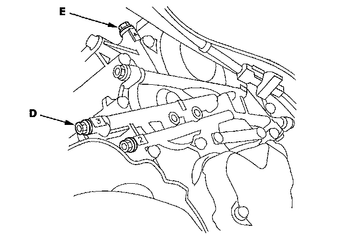 21. Connect the A/T oil pressure gauge to the 3rd clutch pressure inspection port (D) and the 4th clutch pressure inspection port (E).