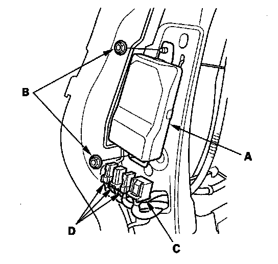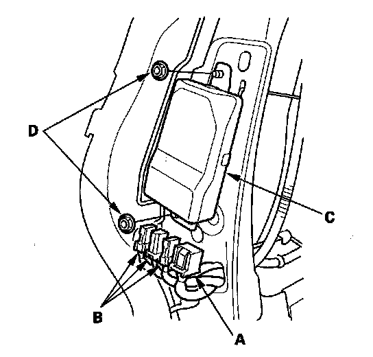 1. Place the ODS unit (A) on the seat-back frame. Tighten the two nuts (B), and connect the ODS unit harness 18P connector (C) and sensor connectors (D) to the ODS unit.