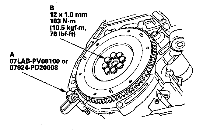 FlywheelTighten the flywheel mounting bolts (B) in a crisscross pattern in several steps.