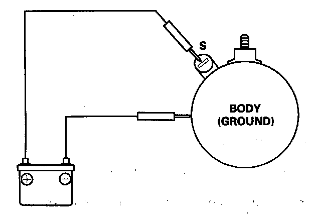 3. Connect the battery as shown. Make sure you disconnect the starter motor wire from the solenoid. If the starter pinion moves out, it is working properly.