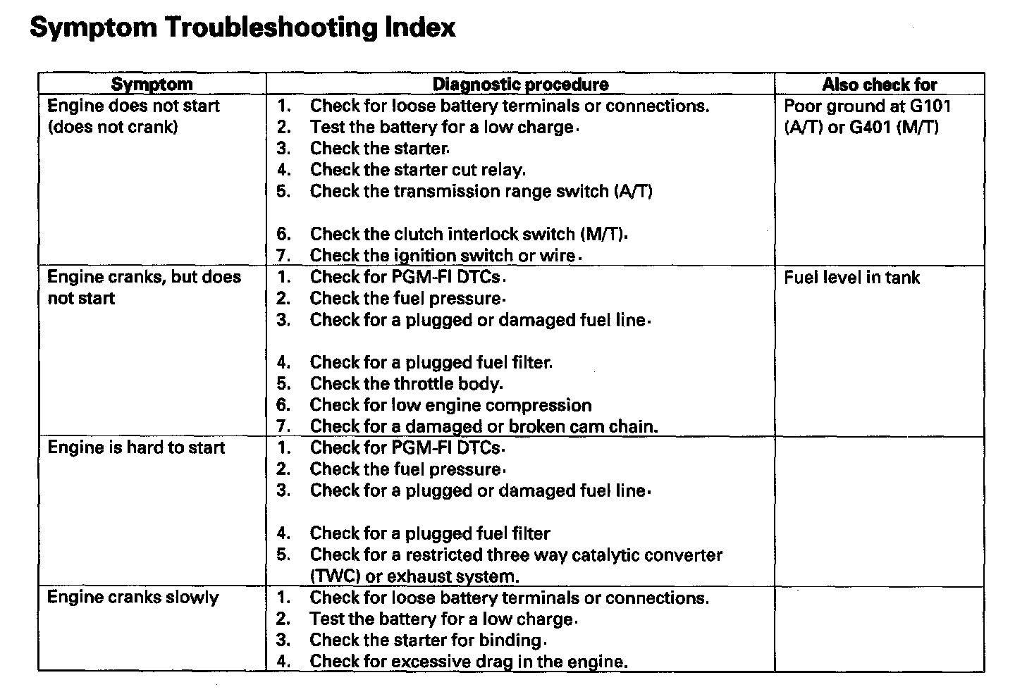 Symptom Troubleshooting Index: