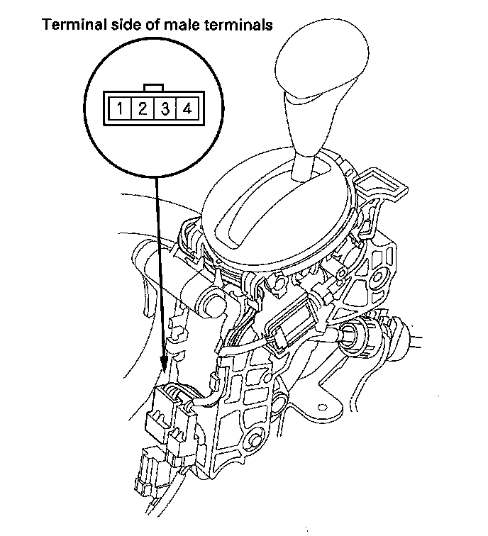 3. Shift out of P, and check for continuity between connector terminals No. 3 and No. 4.