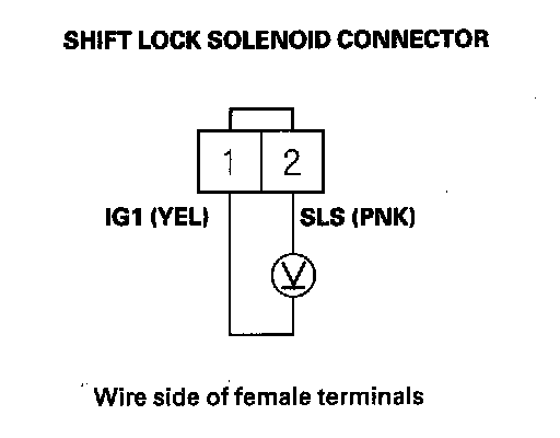 10. Release the brake pedal, and measure the voltage between shift lock solenoid connector terminals No. 1 and No. 2. The shift lever must be in P.