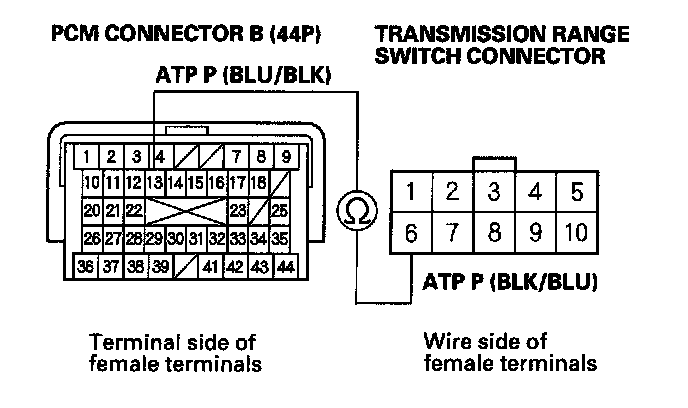 28. Check for continuity between PCM connector terminal B13 and transmission range switch connector terminal No. 6.
