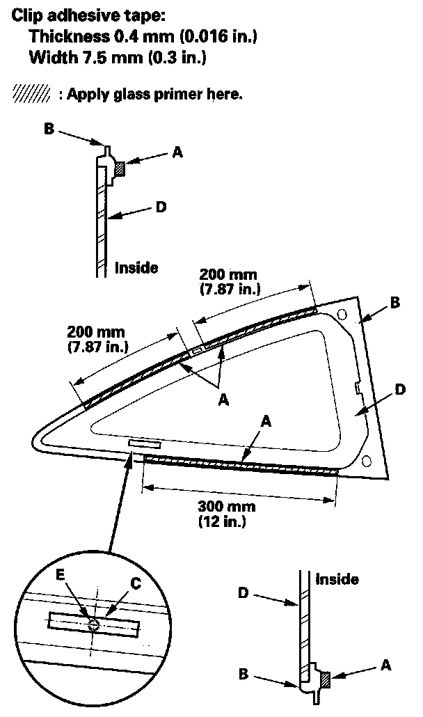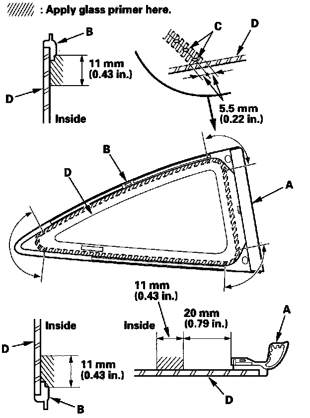 - With the printed dots (C) on the quarter glass (D) as a guide, apply the glass primer to the front portion of the quarter glass.