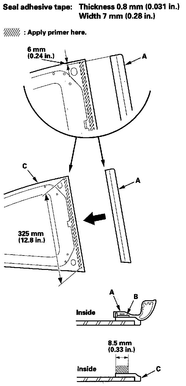 12. Attach the front seal (A) with adhesive tape (B) onto the molding (C).