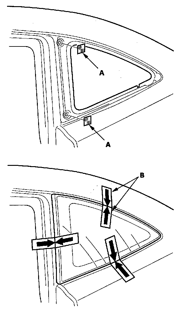 13. If the old quarter glass will be reinstalled (and either clip is broken off the molding), seal the body holes with pieces of urethane tape (A). Then set the quarter glass upright in the opening, and make alignment marks (B) across the quarter glass and body with a grease pencil at the three points shown. Be careful not to touch the quarter glass where adhesive will be applied.