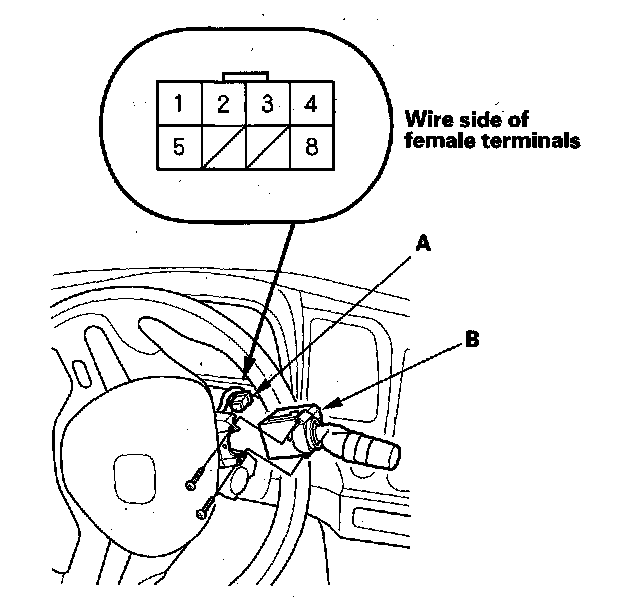 2. Disconnect the dashboard wire harness 8P connector (A) from the wiper/washer switch (B).