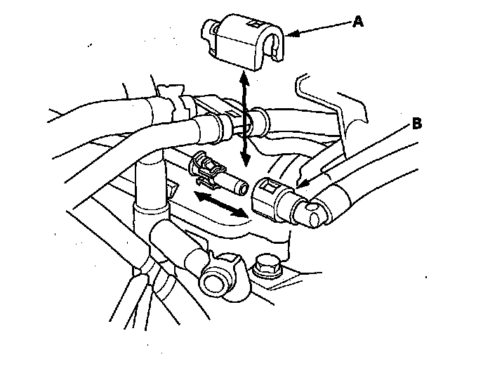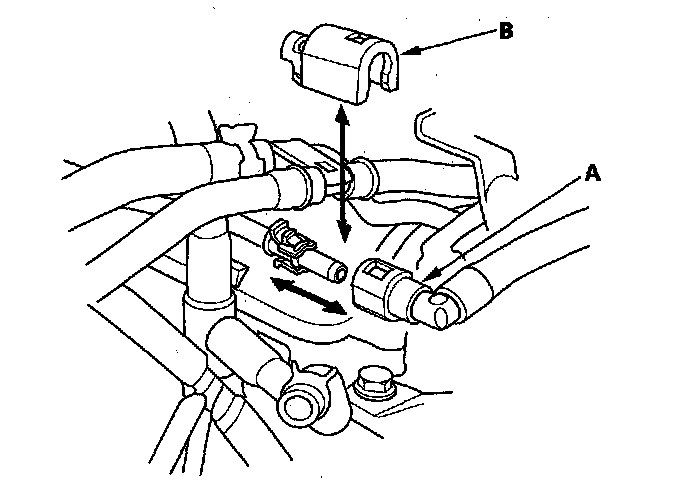 8. Remove the quick-connect fitting cover (A), then disconnect the fuel feed hose (B).