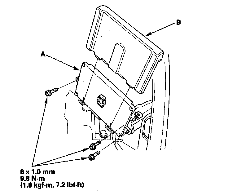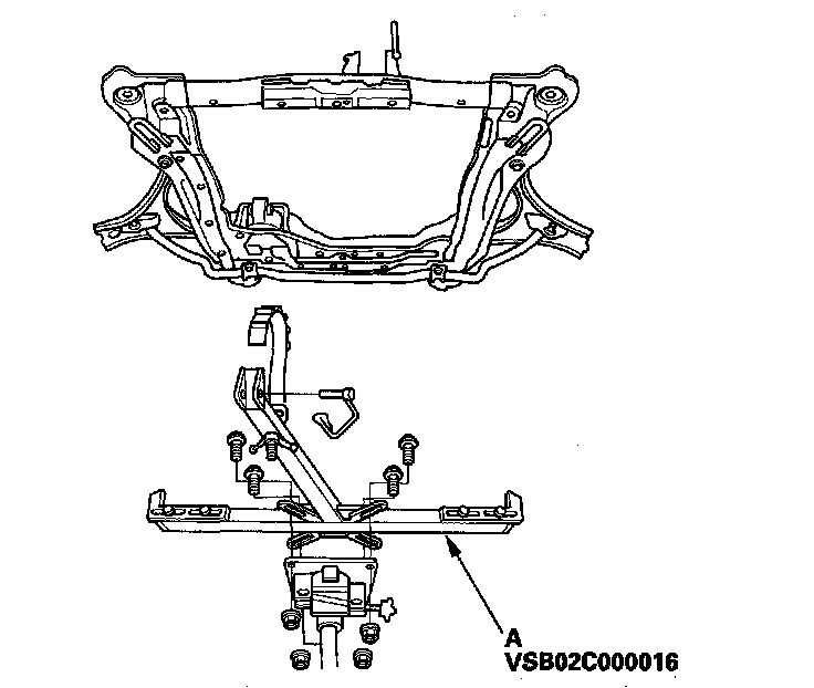 14. Align the front subframe reference marks (A) to the body (B), as noted during removal. Tighten the bolts on the front subframe to the specified torque.