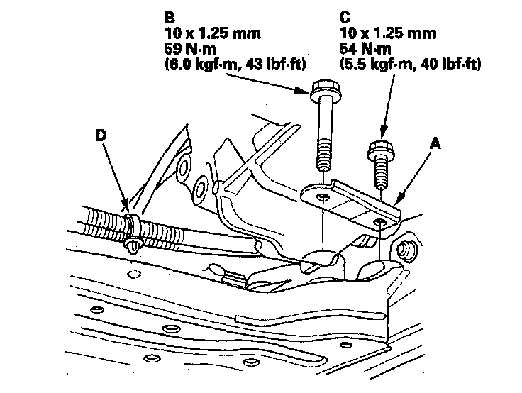 28. Install the stiffener (B), then tighten the steering gearbox mounting bolt (C) and stiffener mounting bolt (D).