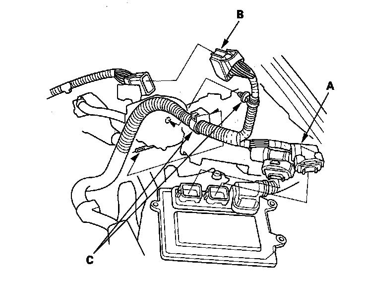 47. Connect the engine control module (ECM) connectors (A) and engine wire harness connector (B).