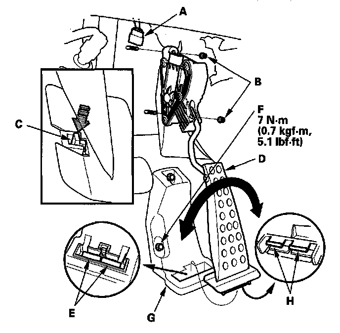 - If the tab or tab receivers (E) are damaged, pull back the carpet, remove the nut (F), and replace the pedal stop (G).