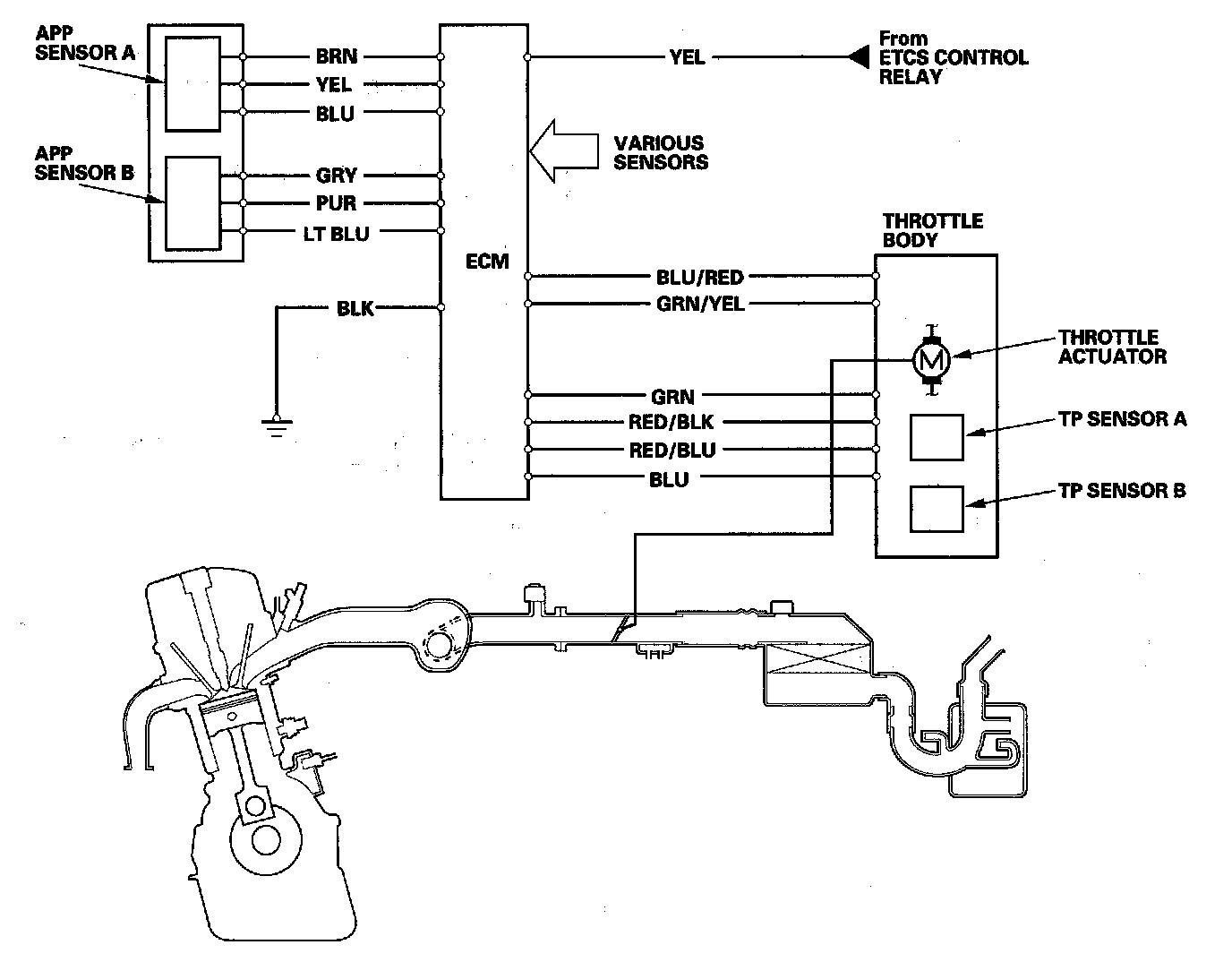Electronic Throttle Control System DiagramThe electronic throttle control system consists of the throttle actuator, throttle position (TP) sensor A/B, accelerator pedal position (APP) sensor A/B, the electronic throttle control system (ETCS) control relay, and the ECM.