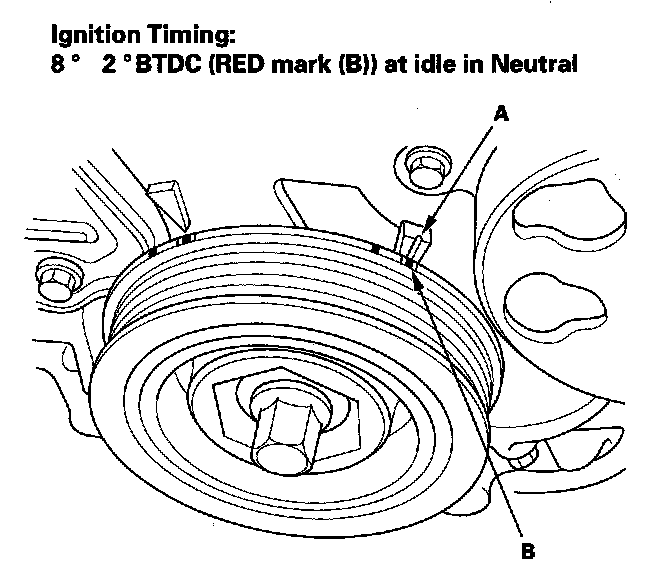 9. Aim the light toward the pointer (A) on the cam chain case. Check the ignition timing under a no load condition (headlights, blower fan, rear window defogger, and air conditioner are turned off).