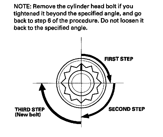 After torquing, tighten all cylinder head bolts in two steps (90° per step). If you are using a new cylinder head bolt, tighten the bolt an extra 90°