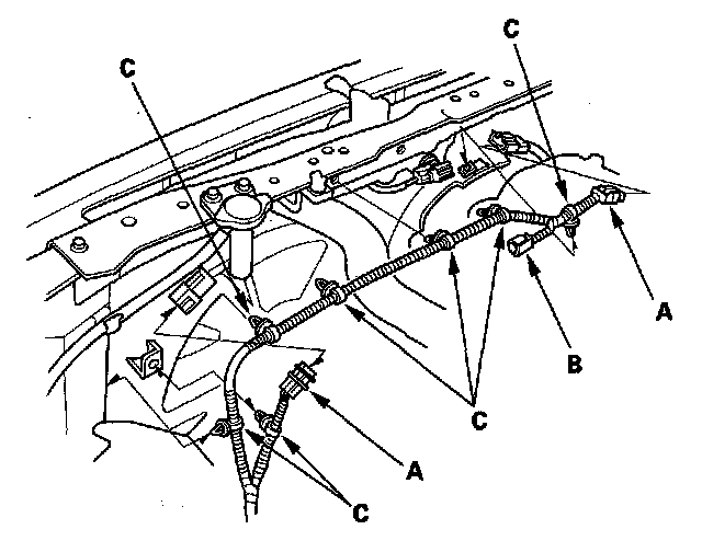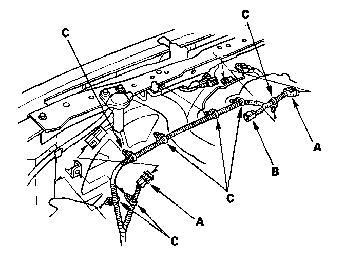 5. Disconnect the fan motor connectors (A) and hood switch connector (B), then remove the harness clamps (C).