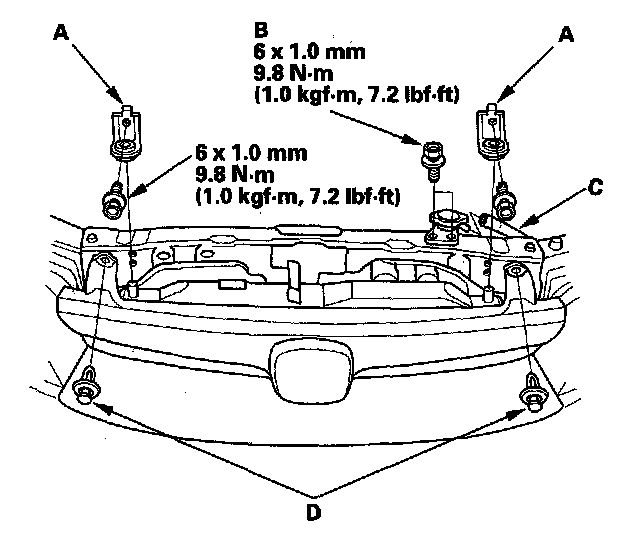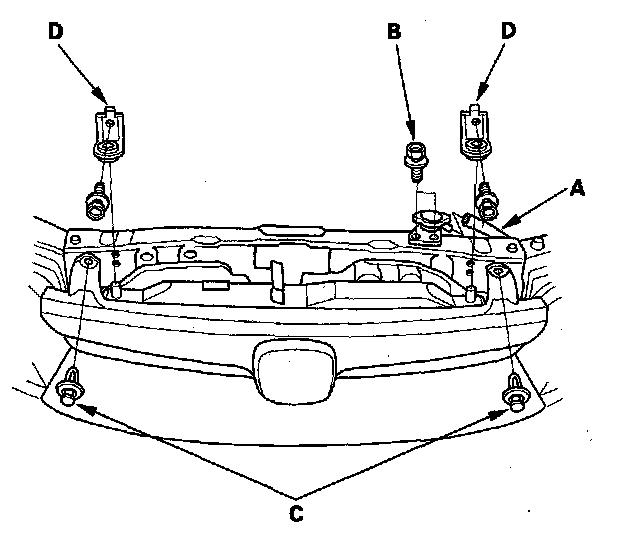 6. Remove the reservoir hose (A), radiator cap base mounting bolts (B), clips (C) and radiator upper brackets (D).