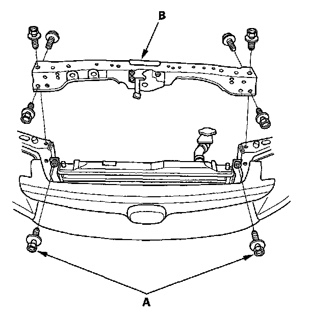 7. Remove the condenser bracket mounting bolts (A), then remove the bulkhead (B).