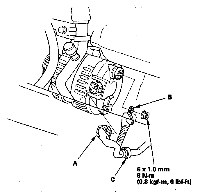9. Disconnect the alternator connector (A), BLK wire (B) and harness clamp (C) from the alternator, then remove the alternator.