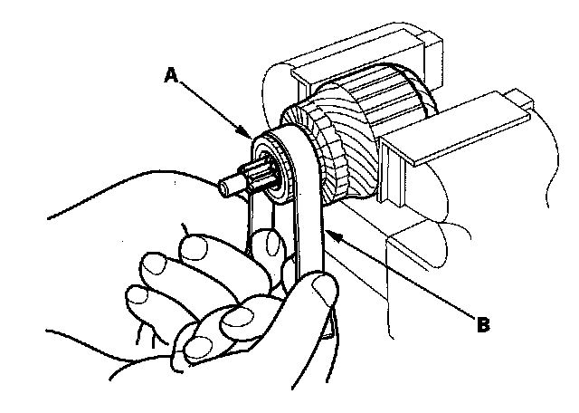 4. Check the commutator (A) surface. If the surface is dirty or burnt, resurface it with an emery cloth or a lathe to the specifications in step 5, or recondition with #500 or #600 sandpaper (B).