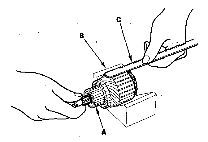 9. Place the armature (A) on an armature tester (B). Hold a hacksaw blade (C) on the armature core. If the blade is attracted to the core or vibrates while the core is turned, the armature is shorted. Replace the armature.