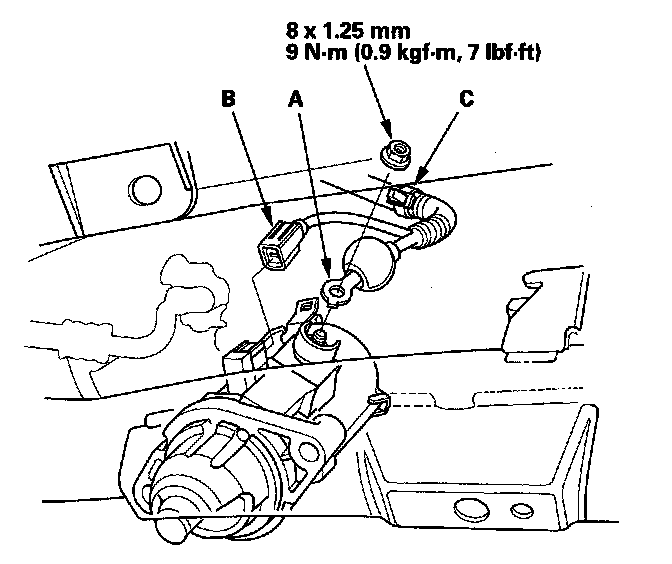 7. Remove the harness clamp (C), then remove the starter.