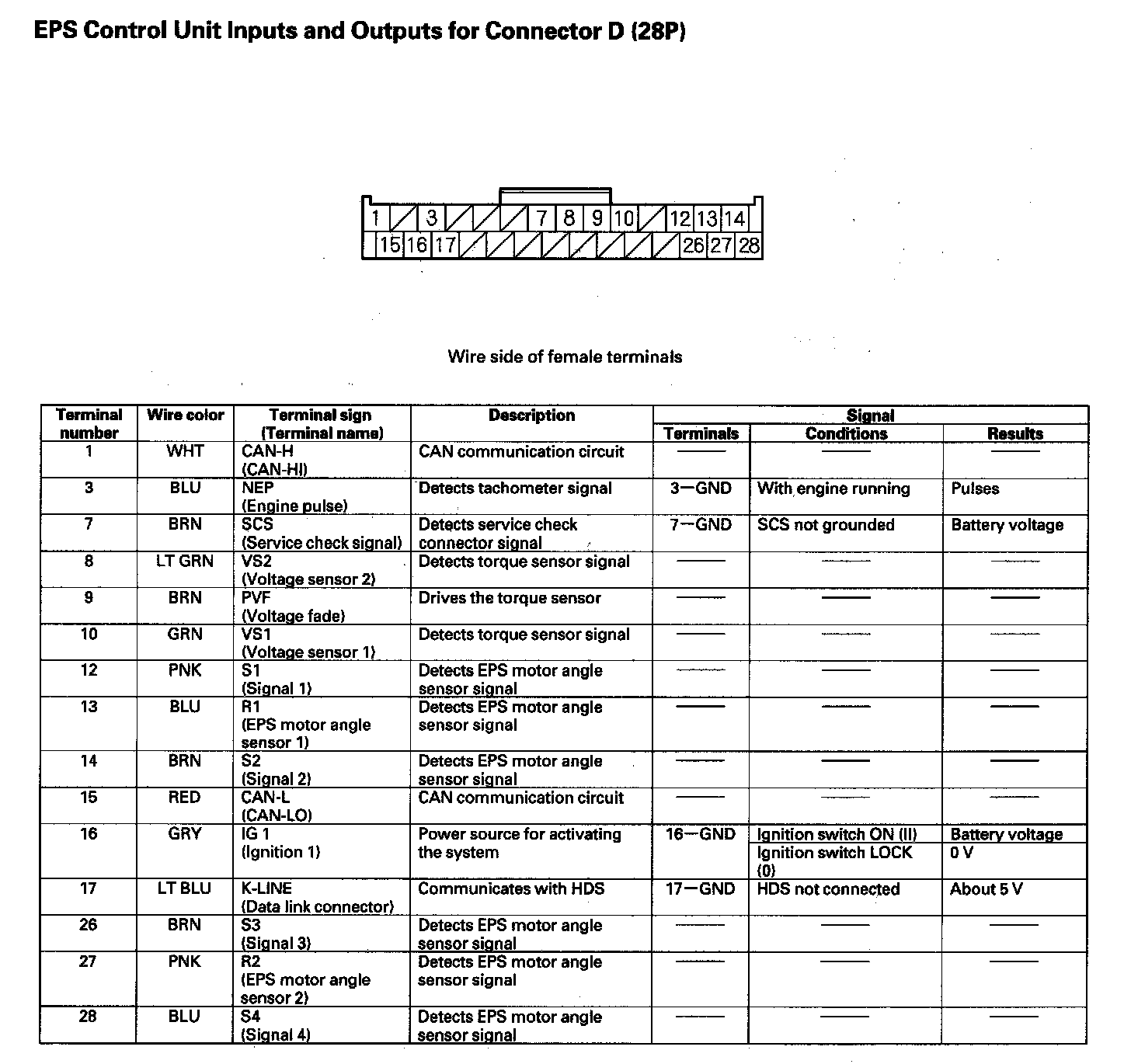 EPS Control Unit Inputs and Outputs for Connector D (28P):